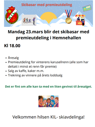 Velkommen til Hemnehallen mandag 23.mars. Da blir det premieutdeling for vinterens karusellrenn, samt åresalg og salg av kaffe og kaker.
